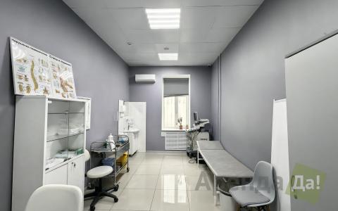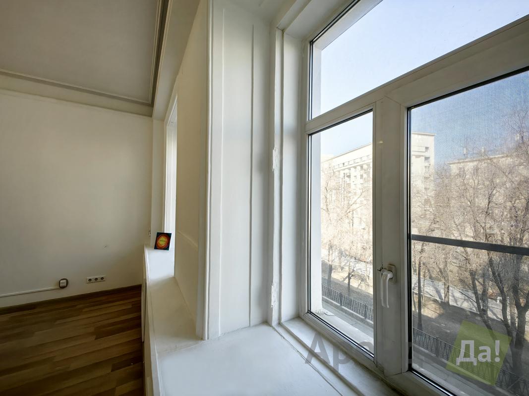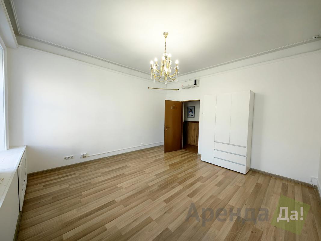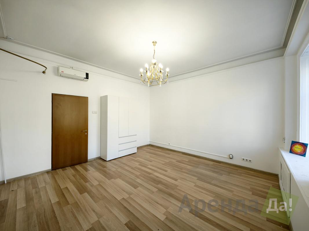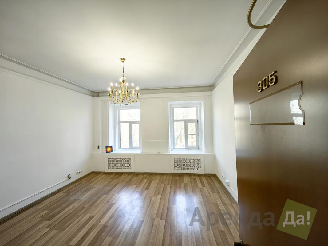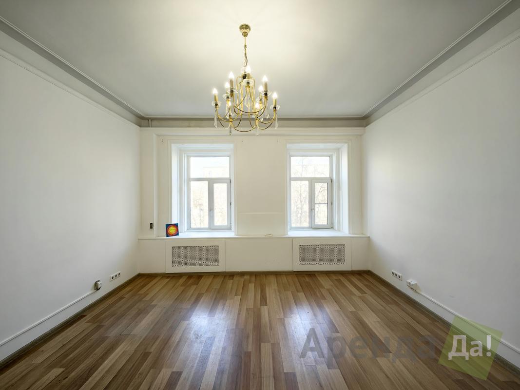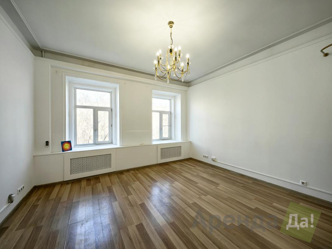 Просторное помещение правильной прямоугольной формы с высокими потолками и с двумя окнами, которые выходят на Покровский бульвар. Презентабельная входная группа.