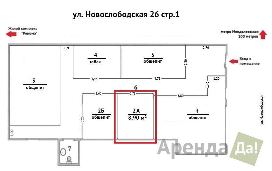 Торговое помещение на Новослободской 26, находится в непосредственной близости торговых и бизнес-центров с многочисленными посетителями – потенциальными покупателями.