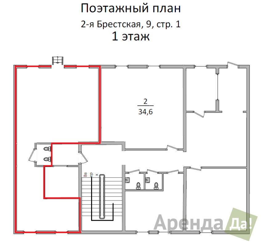 Помещение расположено на 1-м этаже БЦ Маяк по адресу 2-я Брестская, д. 9, стр. 1. Здание 4 000 м2 заполнено арендаторами и сотрудниками ФГУП «Заря».
