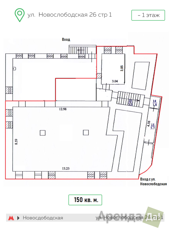 Торговое помещение на Новослободской 26, находится в непосредственной близости торговых и бизнес-центров с многочисленными посетителями – потенциальными покупателями.