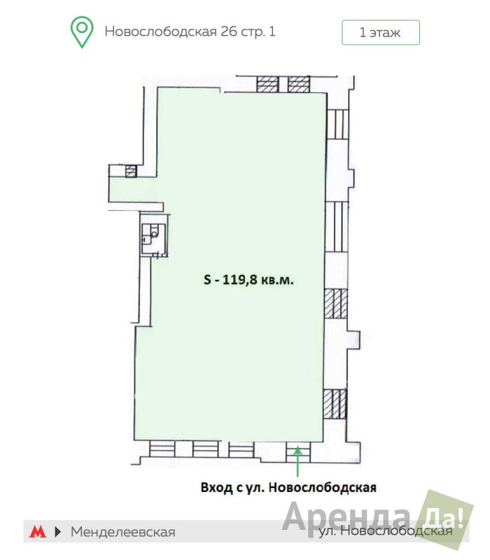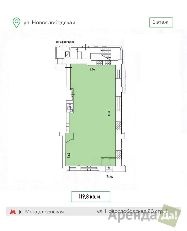 Торговое помещение на Новослободской 26, находится в непосредственной близости торговых и бизнес-центров с многочисленными посетителями – потенциальными покупателями.