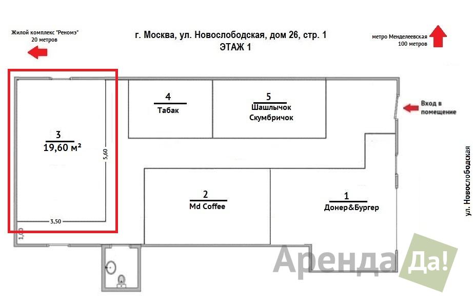 Торговое помещение на Новослободской 26, находится в непосредственной близости торговых и бизнес-центров с многочисленными посетителями – потенциальными покупателями.