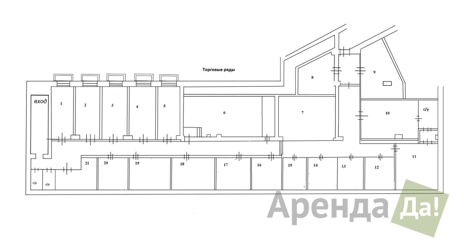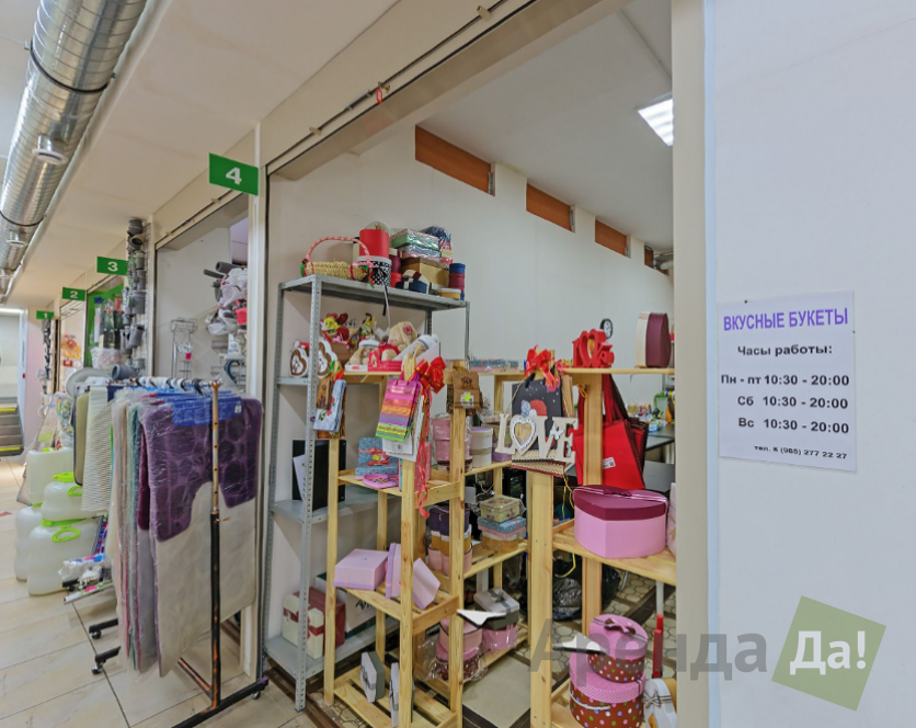 Помещение разделено на 22 торговых павильона от 13 кв. м. до 50 кв. м. Арендаторы подобраны в соответствии с потребностями населения данного района, которые были выявлены при проведении опроса. Помещение пользуется стабильно высоким спросом у арендаторов и клиентов.